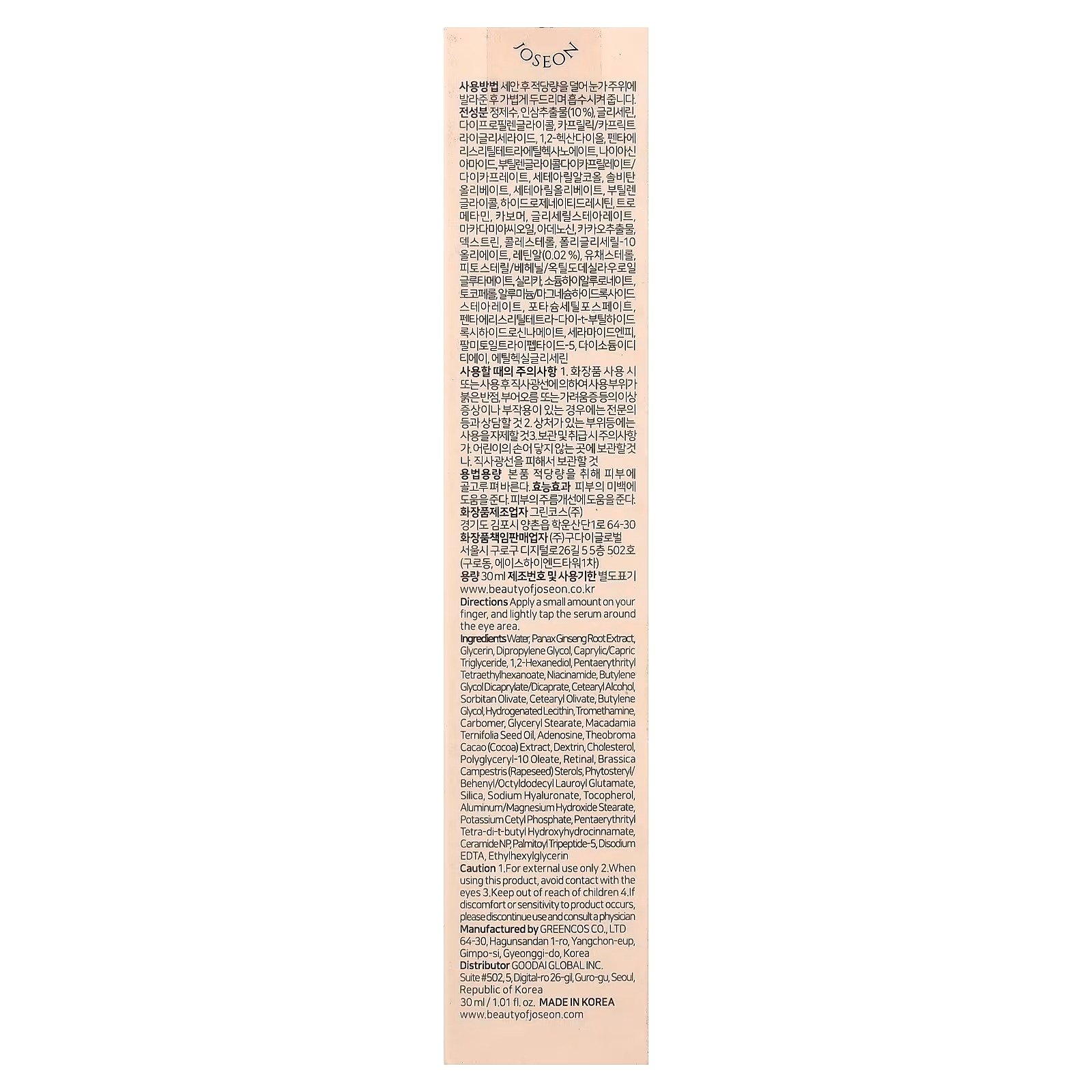 Água, glicerina, dimetildietilenoglicol, caprylic/capric triglyceride, 1,2-hexanediol, butylene glycol dicaprylate/dicaprate, nicotinamida, pentaerythrityl tetraethylhexanoate, álcool cetoestearílico, cetearyl olivate, sorbitan olivate, butilenoglicol, lecitina hidrogenada, extrato da raiz de Panax ginseng, carbômero, monoestearato de glicerila, trometamol, óleo da semente de Macadamia ternifolia,ethylhexylglycerin, adenosina, colesterol, dextrina, oleato de poliglicerila-10, extrato de Theobroma cacao (cacau), esteróis de Brassica campestris (colza), edetato dissódico, fitoesterol/behenil/octyldodecyl lauroyl glutamate, na retina, sílica, estearato de hidróxido de alumínio/magnésio, hialuronato de sódio, tocoferol, fosfato cetílico de potássio, pentaerythrityl tetra-di-t-butyl hydroxyhydrocinnamate, ceramida NP, palmitoyl tripeptides-5.